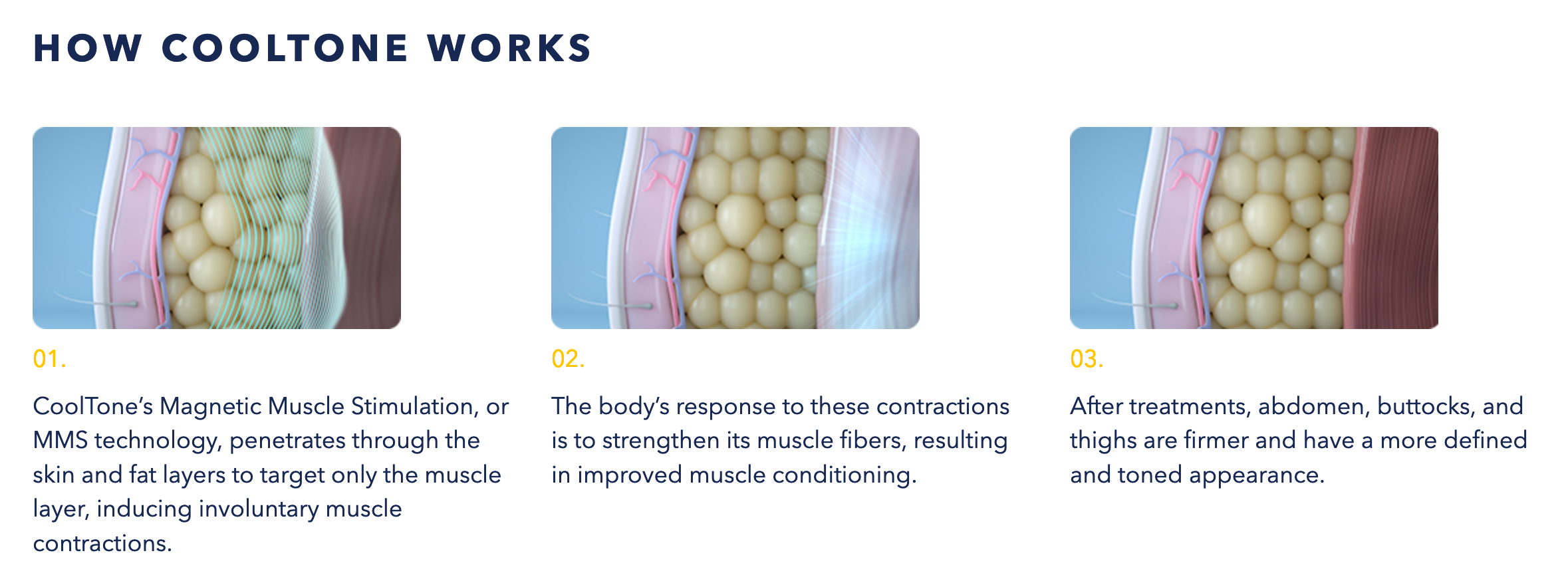 Important Safety Information: The CoolTone procedure is not for everyone. CoolTone should not be used in the head or heart area. You should not have the CoolTone treatment in areas with metal or electronic implants/devices like cardiac pacemakers, implanted hearing devices, implanted defibrillators, implanted neurostimulators, drug pumps, and hearing aids. Tell your doctor if you have any medical conditions and any known sensitivities or allergies as CoolTone should not be used over menstruating uterus, over areas of the skin that lack normal sensation, in areas of new bone growth, or in patients with fever, malignant tumor, hemorrhagic conditions, epilepsy, recent surgical procedure, pulmonary valve defect, pregnancy, sensitivity or allergy to latex.